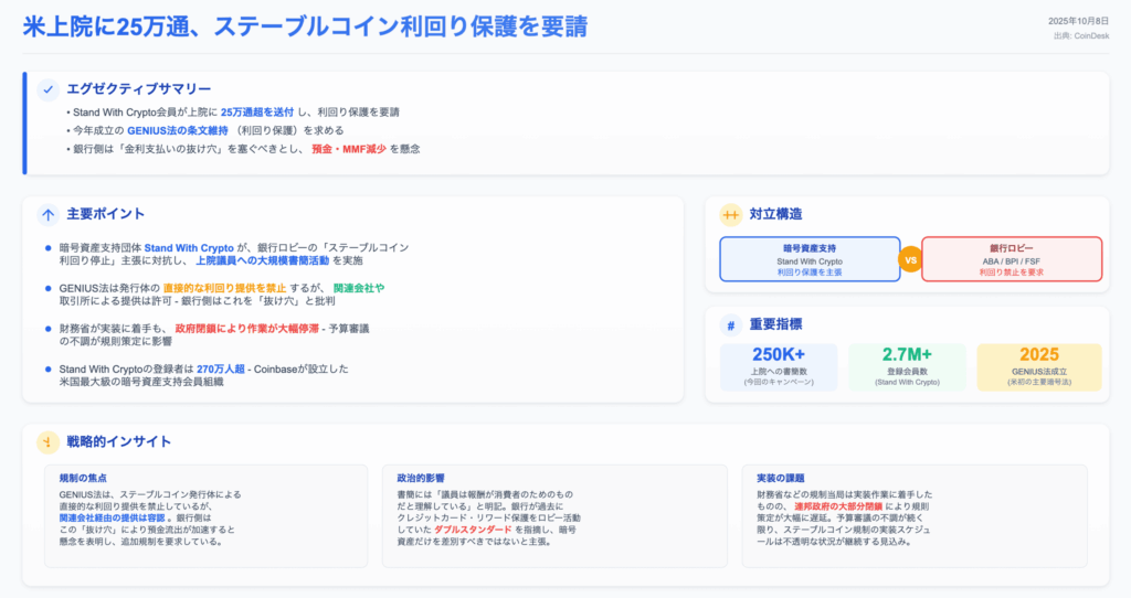 ・アドボカシー団体Stand With Cryptoは、銀行ロビーが主張する「ステーブルコイン利回りを停止すべき」というメッセージに対抗するため、米上院議員への書簡活動を主導した。